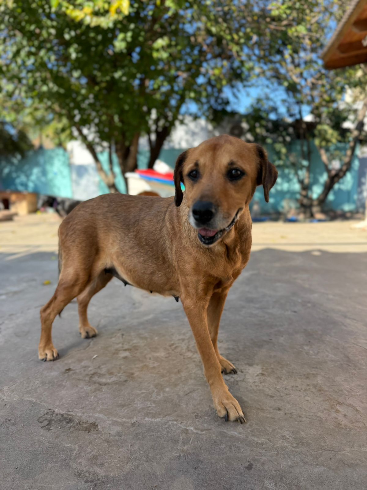 Tiene alrededor de 10 años, es de tamaño grande, adorable y noble, de esas perras que enamoran con solo mirarlas. Merece que los años que tiene por delante sean los más felices de su vida.